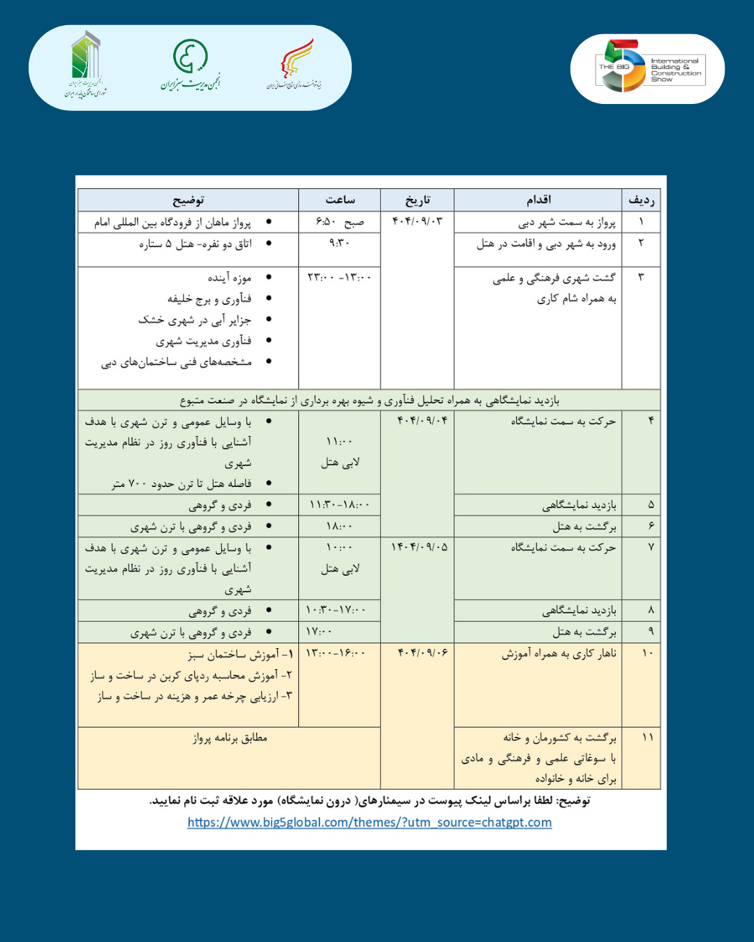 در همین راستا، انجمن مدیریت سبز ایران اعلام کرده است که با هدف گسترش همکاریهای بینالمللی، تبادل دانش فنی و آشنایی با آخرین فناوریهای سازگار با محیطزیست، گروهی از کارشناسان و مدیران فعال در حوزه ساختمان و محیطزیست را برای بازدید و حضور در نمایشگاه بینالمللی BIG 5 دبی اعزام خواهد کرد.